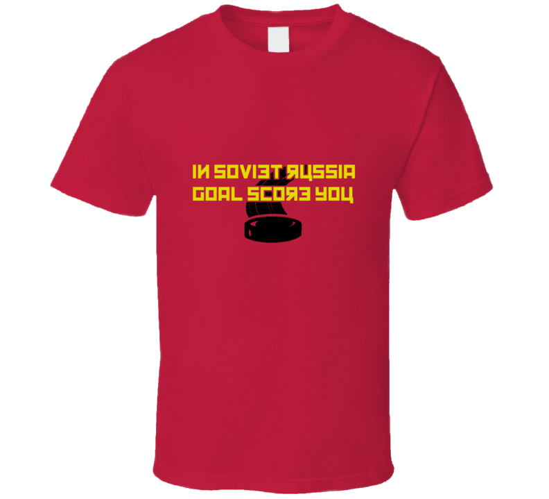 Order your very own In Soviet Russia Goal Score You funny Hockey T shirt. It won’t be around forever so buy yours here today! Shop our huge selection of high quality, graphic apparel. Each design is offered on a variety of sizes and styles including; t shirts, hoodies, aprons and even baby one-pieces! This product is pre-treated to ensure quality and longevity of the graphic.