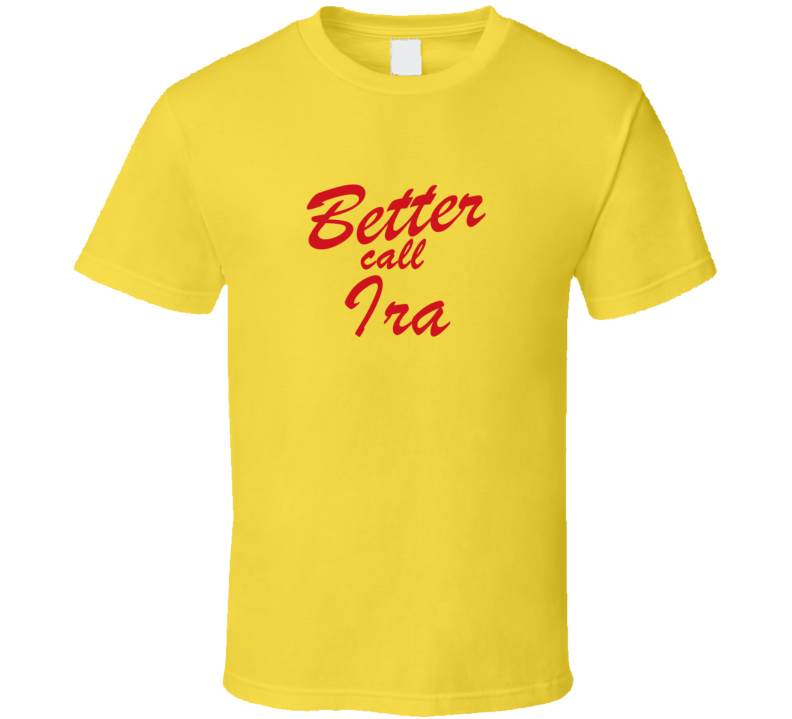 Order your very own Better Call Ira Funny TV Lawyer T Shirt. It won’t be around forever so buy yours here today! Shop our huge selection of high quality, graphic apparel. Each design is offered on a variety of sizes and styles including; t shirts, hoodies, aprons and even baby one-pieces! This product is pre-treated to ensure quality and longevity of the graphic.
