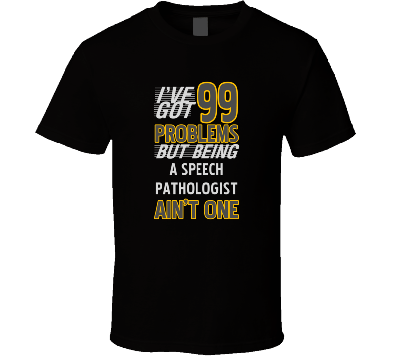 Order your very own 99 Problems But Being A Speech Pathologist Aint One Funny T Shirt. It won’t be around forever so buy yours here today! Shop our huge selection of high quality, graphic apparel. Each design is offered on a variety of sizes and styles including; t shirts, hoodies, aprons and even baby one-pieces! This product is pre-treated to ensure quality and longevity of the graphic.