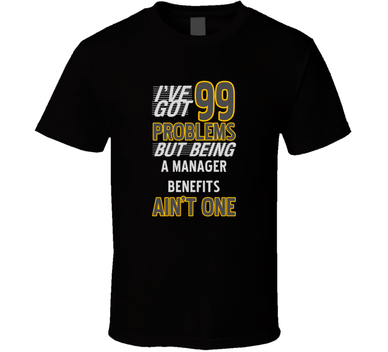 Order your very own 99 Problems But Being A Manager Benefits Aint One Funny T Shirt. It won’t be around forever so buy yours here today! Shop our huge selection of high quality, graphic apparel. Each design is offered on a variety of sizes and styles including; t shirts, hoodies, aprons and even baby one-pieces! This product is pre-treated to ensure quality and longevity of the graphic.