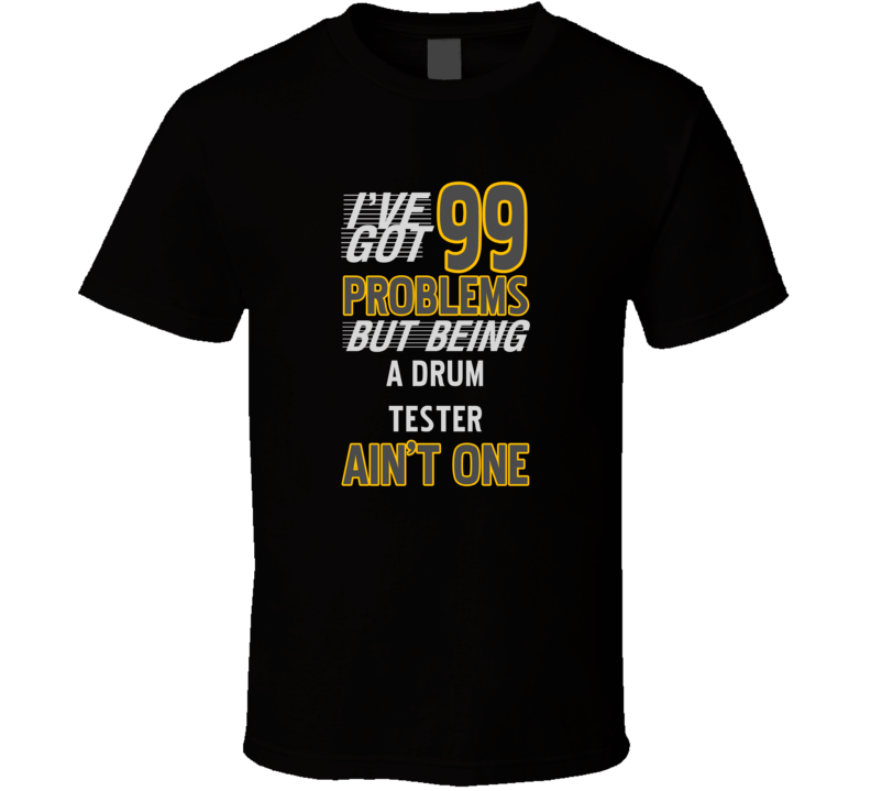 Order your very own 99 Problems But Being A Drum Tester Aint One Funny T Shirt. It won’t be around forever so buy yours here today! Shop our huge selection of high quality, graphic apparel. Each design is offered on a variety of sizes and styles including; t shirts, hoodies, aprons and even baby one-pieces! This product is pre-treated to ensure quality and longevity of the graphic.
