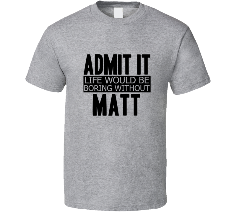 Order your very own Admit It Life Would Be Boring Without Matt Cool Funny T Shirt. It won’t be around forever so buy yours here today! Shop our huge selection of high quality, graphic apparel. Each design is offered on a variety of sizes and styles including; t shirts, hoodies, aprons and even baby one-pieces! This product is pre-treated to ensure quality and longevity of the graphic.