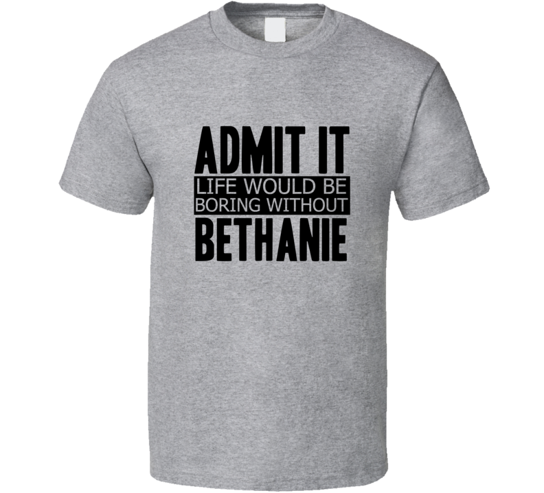 Order your very own Admit It Life Would Be Boring Without Bethanie Cool Funny T Shirt. It won’t be around forever so buy yours here today! Shop our huge selection of high quality, graphic apparel. Each design is offered on a variety of sizes and styles including; t shirts, hoodies, aprons and even baby one-pieces! This product is pre-treated to ensure quality and longevity of the graphic.