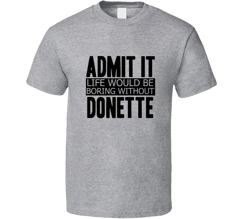 Order your very own Admit It Life Would Be Boring Without Donette Cool Funny T Shirt. It won’t be around forever so buy yours here today! Shop our huge selection of high quality, graphic apparel. Each design is offered on a variety of sizes and styles including; t shirts, hoodies, aprons and even baby one-pieces! This product is pre-treated to ensure quality and longevity of the graphic.
