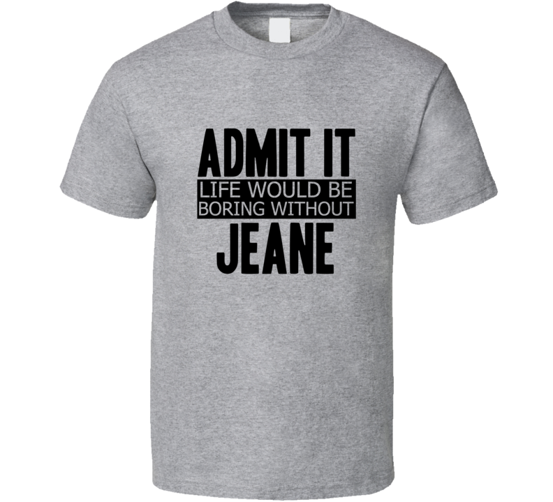 Order your very own Admit It Life Would Be Boring Without Jeane Cool Funny T Shirt. It won’t be around forever so buy yours here today! Shop our huge selection of high quality, graphic apparel. Each design is offered on a variety of sizes and styles including; t shirts, hoodies, aprons and even baby one-pieces! This product is pre-treated to ensure quality and longevity of the graphic.