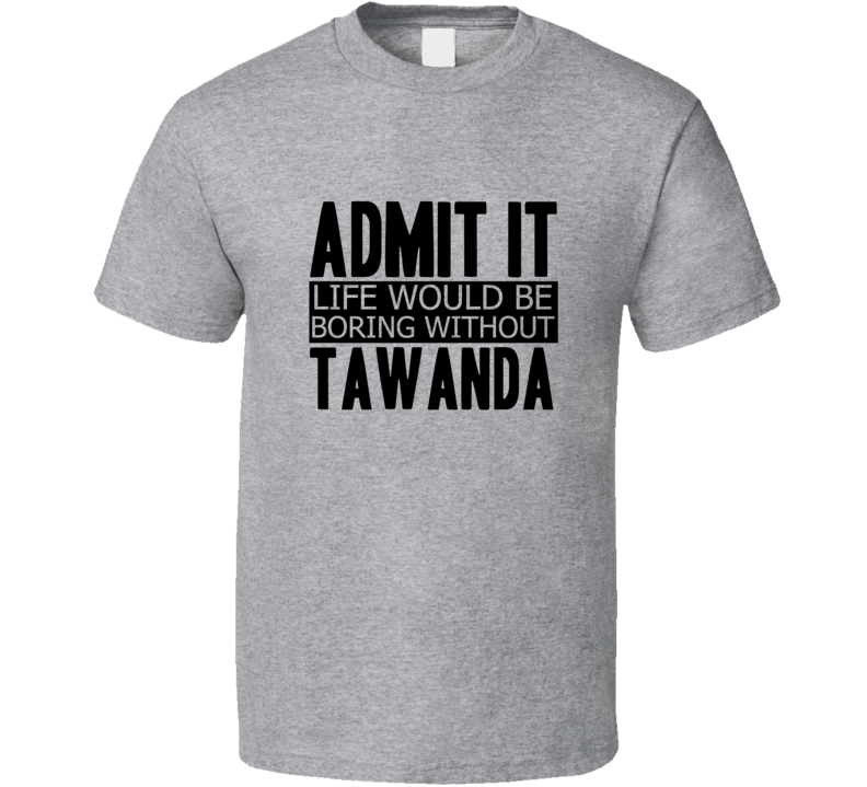 Order your very own Admit It Life Would Be Boring Without Tawanda Cool Funny T Shirt. It won’t be around forever so buy yours here today! Shop our huge selection of high quality, graphic apparel. Each design is offered on a variety of sizes and styles including; t shirts, hoodies, aprons and even baby one-pieces! This product is pre-treated to ensure quality and longevity of the graphic.