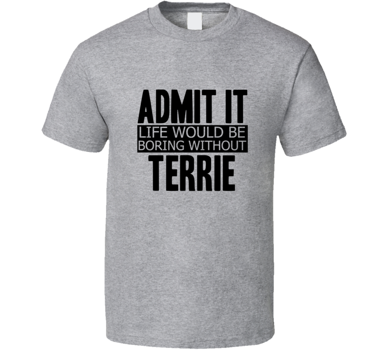 Order your very own Admit It Life Would Be Boring Without Terrie Cool Funny T Shirt. It won’t be around forever so buy yours here today! Shop our huge selection of high quality, graphic apparel. Each design is offered on a variety of sizes and styles including; t shirts, hoodies, aprons and even baby one-pieces! This product is pre-treated to ensure quality and longevity of the graphic.