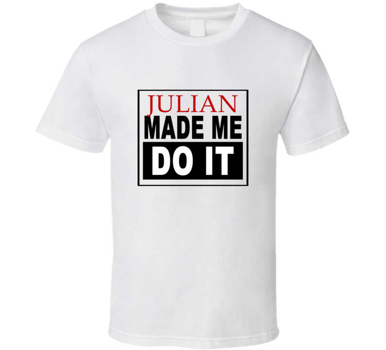 Order your very own Julian Made Me Do It Cool Retro T Shirt. It won’t be around forever so buy yours here today! Shop our huge selection of high quality, graphic apparel. Each design is offered on a variety of sizes and styles including; t shirts, hoodies, aprons and even baby one-pieces! This product is pre-treated to ensure quality and longevity of the graphic.