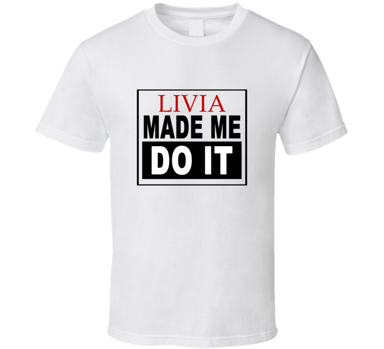 Order your very own Livia Made Me Do It Cool Retro T Shirt. It won’t be around forever so buy yours here today! Shop our huge selection of high quality, graphic apparel. Each design is offered on a variety of sizes and styles including; t shirts, hoodies, aprons and even baby one-pieces! This product is pre-treated to ensure quality and longevity of the graphic.