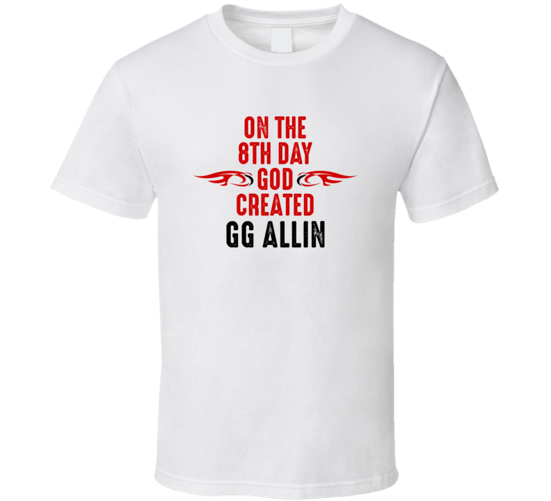 Order your very own On The Eigth Day God Created Gg Allin Celebrities T Shirt. It won’t be around forever so buy yours here today! Shop our huge selection of high quality, graphic apparel. Each design is offered on a variety of sizes and styles including; t shirts, hoodies, aprons and even baby one-pieces! This product is pre-treated to ensure quality and longevity of the graphic.