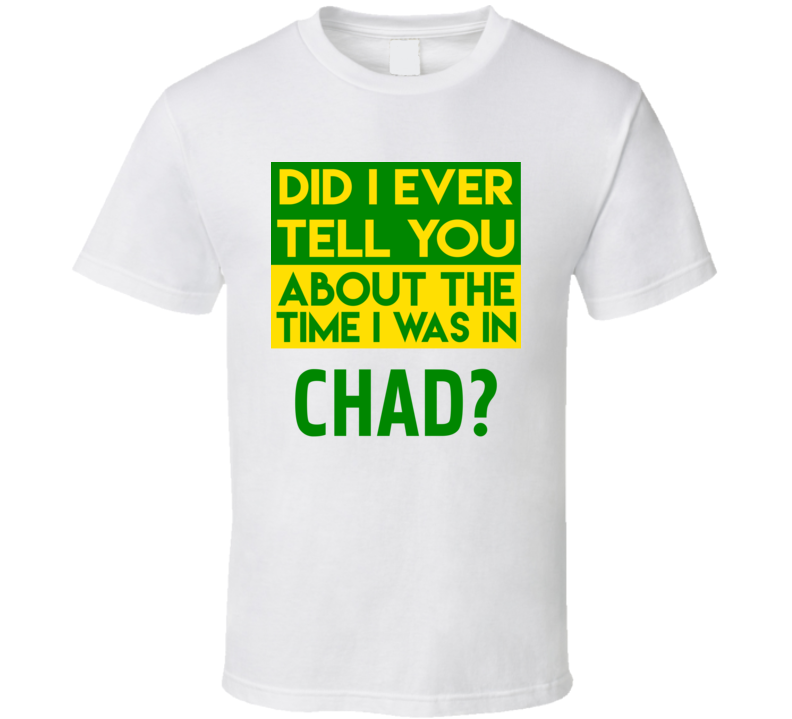 Order your very own Chad Did I Ever Tell You Funny Cool Country Vacation T Shirt. It won’t be around forever so buy yours here today! Shop our huge selection of high quality, graphic apparel. Each design is offered on a variety of sizes and styles including; t shirts, hoodies, aprons and even baby one-pieces! This product is pre-treated to ensure quality and longevity of the graphic.