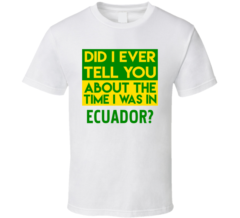 Order your very own Ecuador Did I Ever Tell You Funny Cool Country Vacation T Shirt. It won’t be around forever so buy yours here today! Shop our huge selection of high quality, graphic apparel. Each design is offered on a variety of sizes and styles including; t shirts, hoodies, aprons and even baby one-pieces! This product is pre-treated to ensure quality and longevity of the graphic.