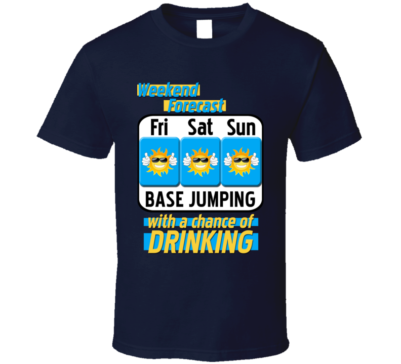 Order your very own Weekend Forecast Base Jumping And Drinking Funny Booze T Shirt. It won’t be around forever so buy yours here today! Shop our huge selection of high quality, graphic apparel. Each design is offered on a variety of sizes and styles including; t shirts, hoodies, aprons and even baby one-pieces! This product is pre-treated to ensure quality and longevity of the graphic.