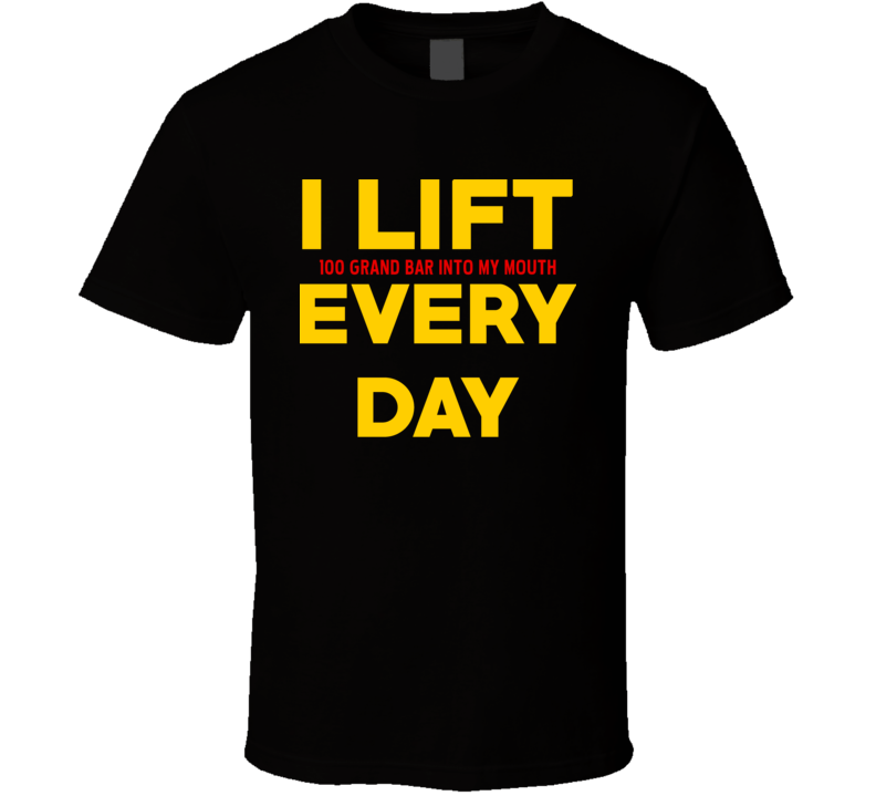 Order your very own I Lift 100 Grand Bar Junk Food Funny T Shirt. It won’t be around forever so buy yours here today! Shop our huge selection of high quality, graphic apparel. Each design is offered on a variety of sizes and styles including; t shirts, hoodies, aprons and even baby one-pieces! This product is pre-treated to ensure quality and longevity of the graphic.
