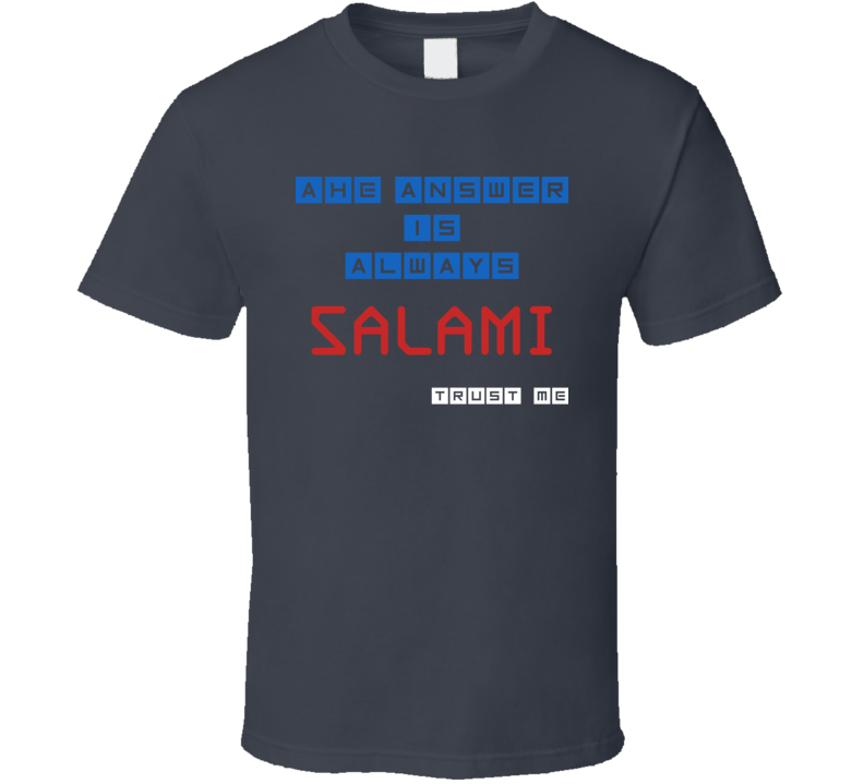 Order your very own The Answer Is Salami Funny Junk Food Booze T Shirt. It won’t be around forever so buy yours here today! Shop our huge selection of high quality, graphic apparel. Each design is offered on a variety of sizes and styles including; t shirts, hoodies, aprons and even baby one-pieces! This product is pre-treated to ensure quality and longevity of the graphic.