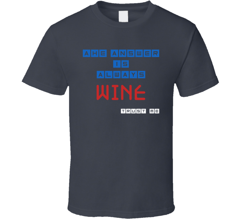 Order your very own The Answer Is Wine Funny Junk Food Booze T Shirt. It won’t be around forever so buy yours here today! Shop our huge selection of high quality, graphic apparel. Each design is offered on a variety of sizes and styles including; t shirts, hoodies, aprons and even baby one-pieces! This product is pre-treated to ensure quality and longevity of the graphic.