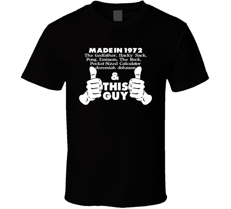 Order your very own Made In 1972 This Guy Born Funny Pop Culture History Parody T Shirt. It won’t be around forever so buy yours here today! Shop our huge selection of high quality, graphic apparel. Each design is offered on a variety of sizes and styles including; t shirts, hoodies, aprons and even baby one-pieces! This product is pre-treated to ensure quality and longevity of the graphic.