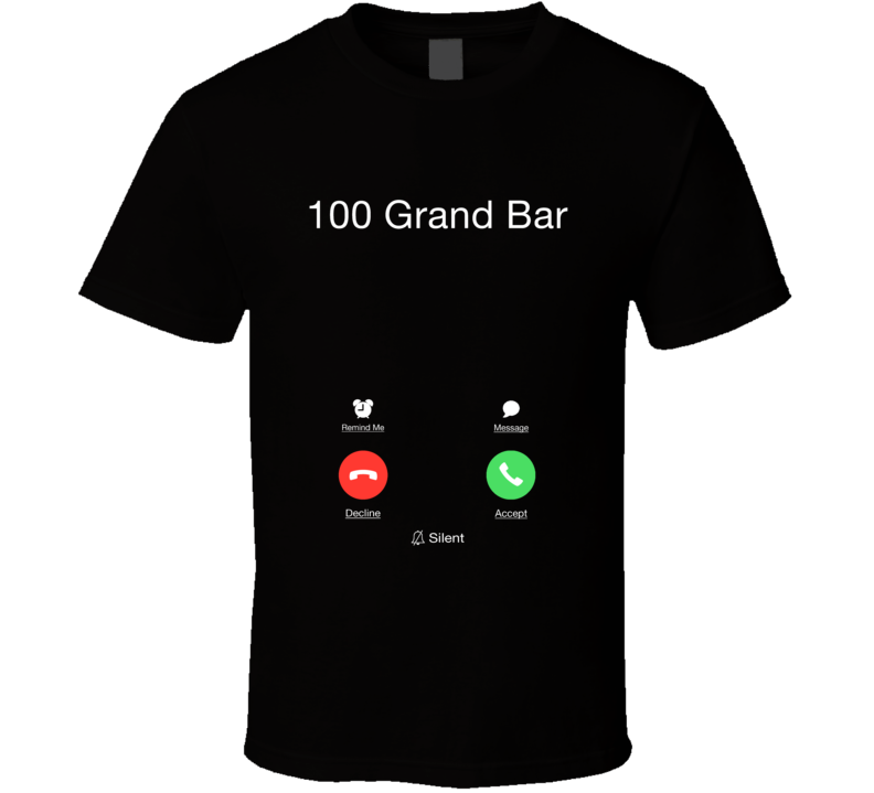 Order your very own 100 Grand Bar Is Calling Funny Smart Phone Cell Food Booze Fan T Shirt. It won’t be around forever so buy yours here today! Shop our huge selection of high quality, graphic apparel. Each design is offered on a variety of sizes and styles including; t shirts, hoodies, aprons and even baby one-pieces! This product is pre-treated to ensure quality and longevity of the graphic.
