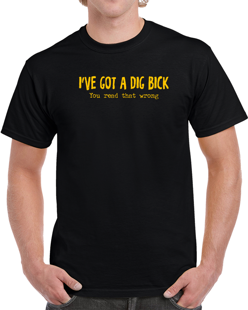Order your very own I've Got A Dig Bick You Read That Wrong Funny Parody T Shirt. It won’t be around forever so buy yours here today! Shop our huge selection of high quality, graphic apparel. Each design is offered on a variety of sizes and styles including; t shirts, hoodies, aprons and even baby one-pieces! This product is pre-treated to ensure quality and longevity of the graphic.
