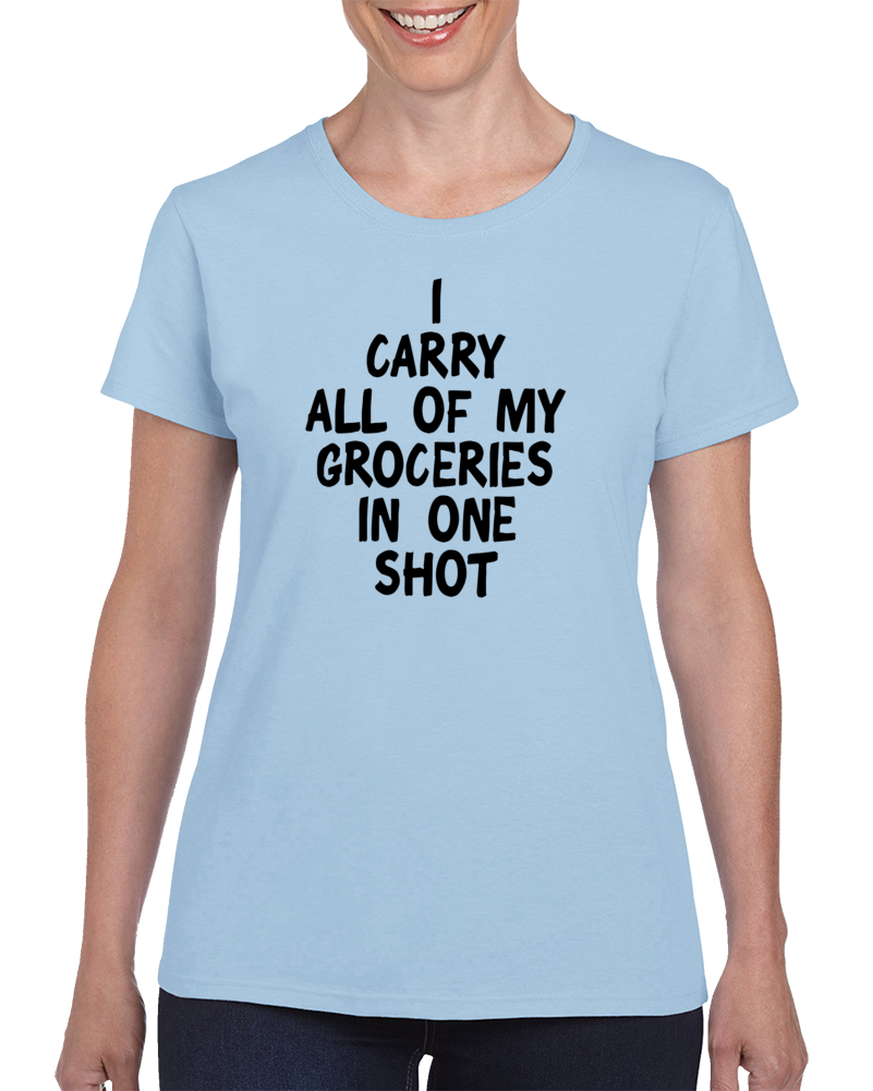 Order your very own I Carry All Of My Groceries In One Shot Funny Quote T Shirt. It won’t be around forever so buy yours here today! Shop our huge selection of high quality, graphic apparel. Each design is offered on a variety of sizes and styles including; t shirts, hoodies, aprons and even baby one-pieces! This product is pre-treated to ensure quality and longevity of the graphic.