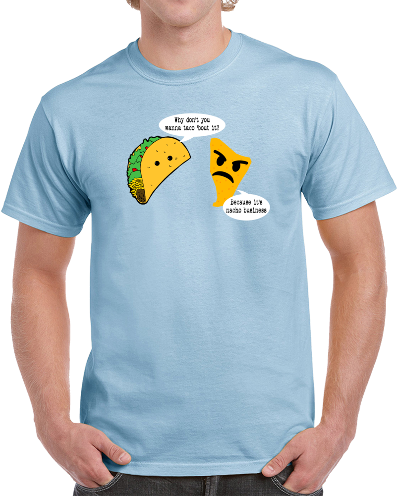 Order your very own Taco Bout It Nacho Business Funny Mexican Food Cartoon T Shirt. It won’t be around forever so buy yours here today! Shop our huge selection of high quality, graphic apparel. Each design is offered on a variety of sizes and styles including; t shirts, hoodies, aprons and even baby one-pieces! This product is pre-treated to ensure quality and longevity of the graphic.