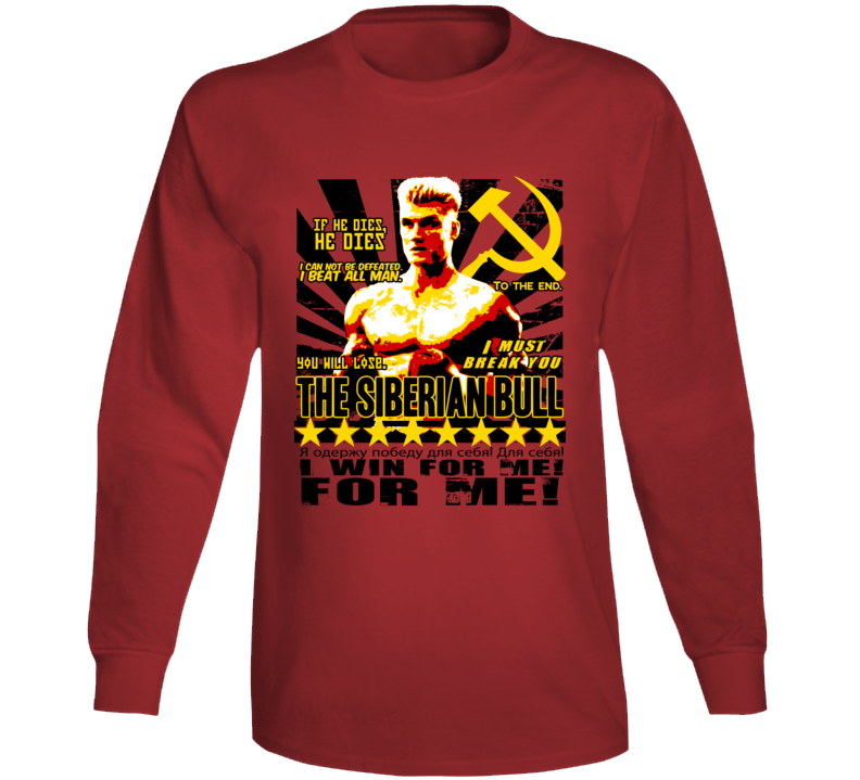Order your very own Ivan Drago Rocky Iv Russian Quotes Boxing Movie T Long Sleeve T Shirt. It won’t be around forever so buy yours here today! Shop our huge selection of high quality, graphic apparel. Each design is offered on a variety of sizes and styles including; t shirts, hoodies, aprons and even baby one-pieces! This product is pre-treated to ensure quality and longevity of the graphic.