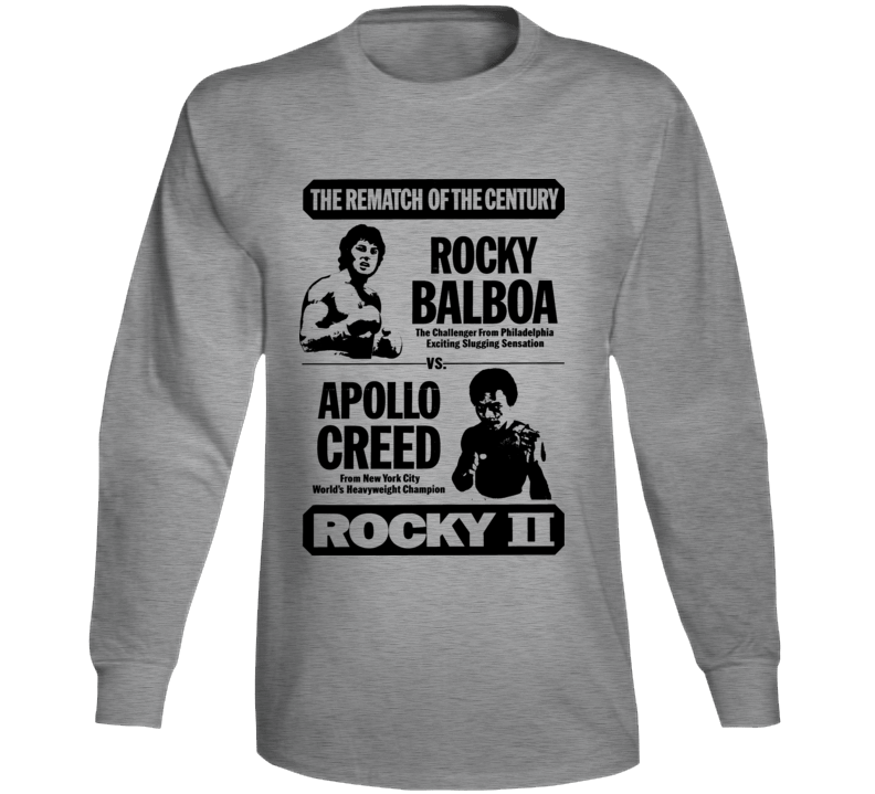 Order your very own Rocky Ii Apollo Creed Boxing Movie T Long Sleeve T Shirt. It won’t be around forever so buy yours here today! Shop our huge selection of high quality, graphic apparel. Each design is offered on a variety of sizes and styles including; t shirts, hoodies, aprons and even baby one-pieces! This product is pre-treated to ensure quality and longevity of the graphic.