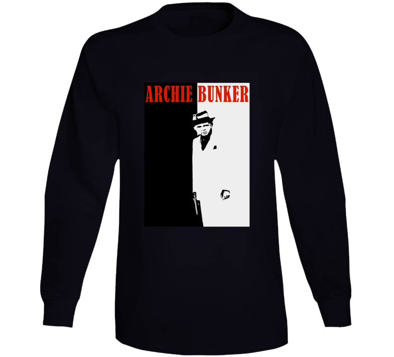 Order your very own Scarface Archie Bunker Funny Retro Mash Up Fan Long Sleeve T Shirt. It won’t be around forever so buy yours here today! Shop our huge selection of high quality, graphic apparel. Each design is offered on a variety of sizes and styles including; t shirts, hoodies, aprons and even baby one-pieces! This product is pre-treated to ensure quality and longevity of the graphic.