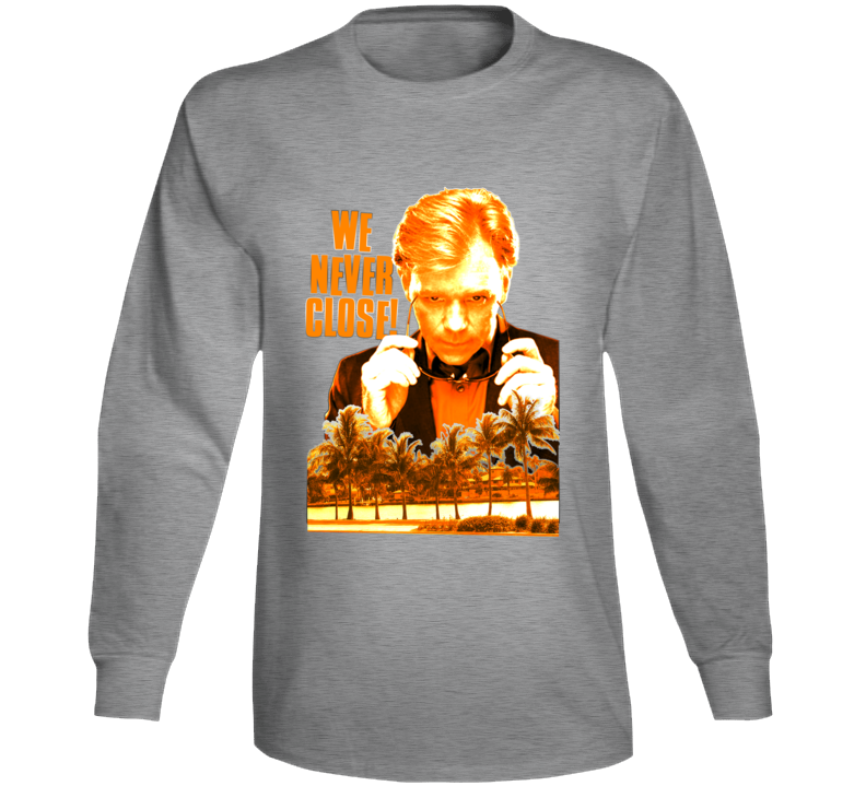 Order your very own Horatio Caine Csi Miami Sunglasses Long Sleeve T Shirt. It won’t be around forever so buy yours here today! Shop our huge selection of high quality, graphic apparel. Each design is offered on a variety of sizes and styles including; t shirts, hoodies, aprons and even baby one-pieces! This product is pre-treated to ensure quality and longevity of the graphic.