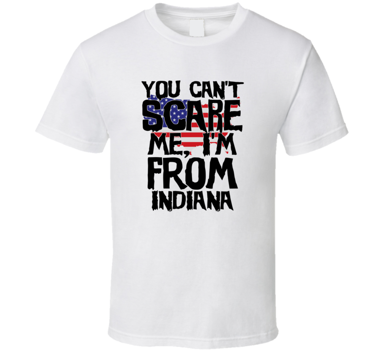 Order your very own Indiana You Can't Scare Me I'm From Funny Proud USA T Shirt. It won’t be around forever so buy yours here today! Shop our huge selection of high quality, graphic apparel. Each design is offered on a variety of sizes and styles including; t shirts, hoodies, aprons and even baby one-pieces! This product is pre-treated to ensure quality and longevity of the graphic.