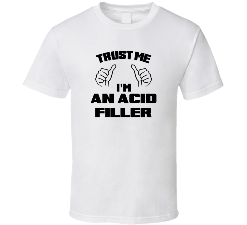 Order your very own Trust Me Im An Acid Filler Job Title Funny T Shirt. It won’t be around forever so buy yours here today! Shop our huge selection of high quality, graphic apparel. Each design is offered on a variety of sizes and styles including; t shirts, hoodies, aprons and even baby one-pieces! This product is pre-treated to ensure quality and longevity of the graphic.