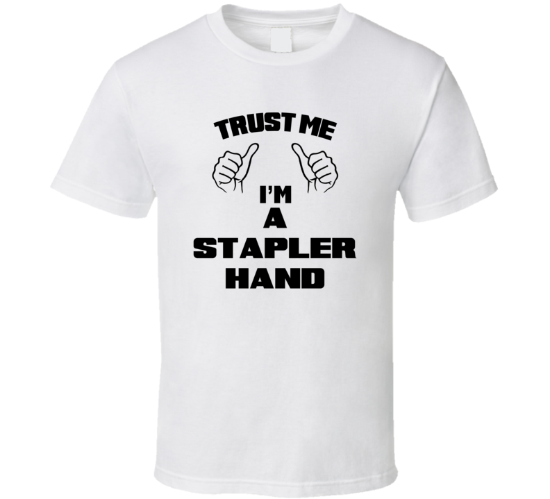 Order your very own Trust Me Im A Stapler Hand Job Title Funny T Shirt. It won’t be around forever so buy yours here today! Shop our huge selection of high quality, graphic apparel. Each design is offered on a variety of sizes and styles including; t shirts, hoodies, aprons and even baby one-pieces! This product is pre-treated to ensure quality and longevity of the graphic.
