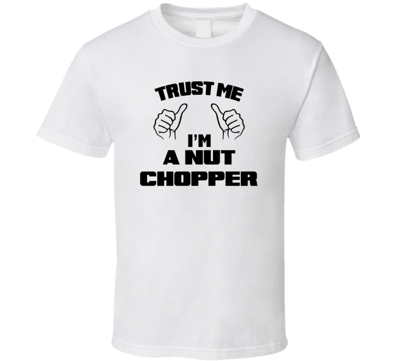 Order your very own Trust Me Im A Nut Chopper Job Title Funny T Shirt. It won’t be around forever so buy yours here today! Shop our huge selection of high quality, graphic apparel. Each design is offered on a variety of sizes and styles including; t shirts, hoodies, aprons and even baby one-pieces! This product is pre-treated to ensure quality and longevity of the graphic.